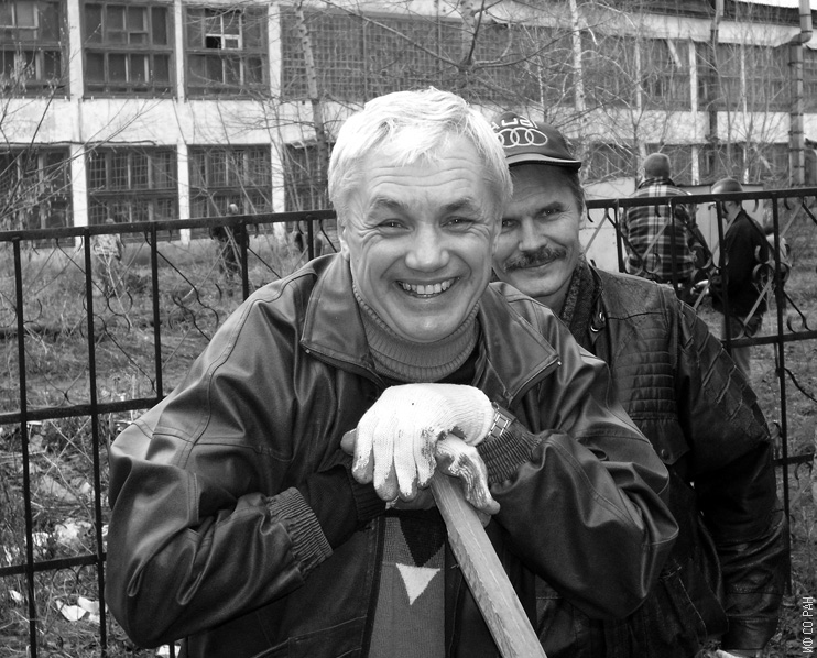 Панкрац Анатолий Иванович (слева) и Воротынов Александр Михайлович, сотрудники лаборатоии резонансных свойств магнитоупорядоченных веществ Института физики им. Л.В. Киренского Сибирского отделения Российской академии наук (ИФ СО РАН), во время субботника по уборке территории института. 2004 год. Красноярск.