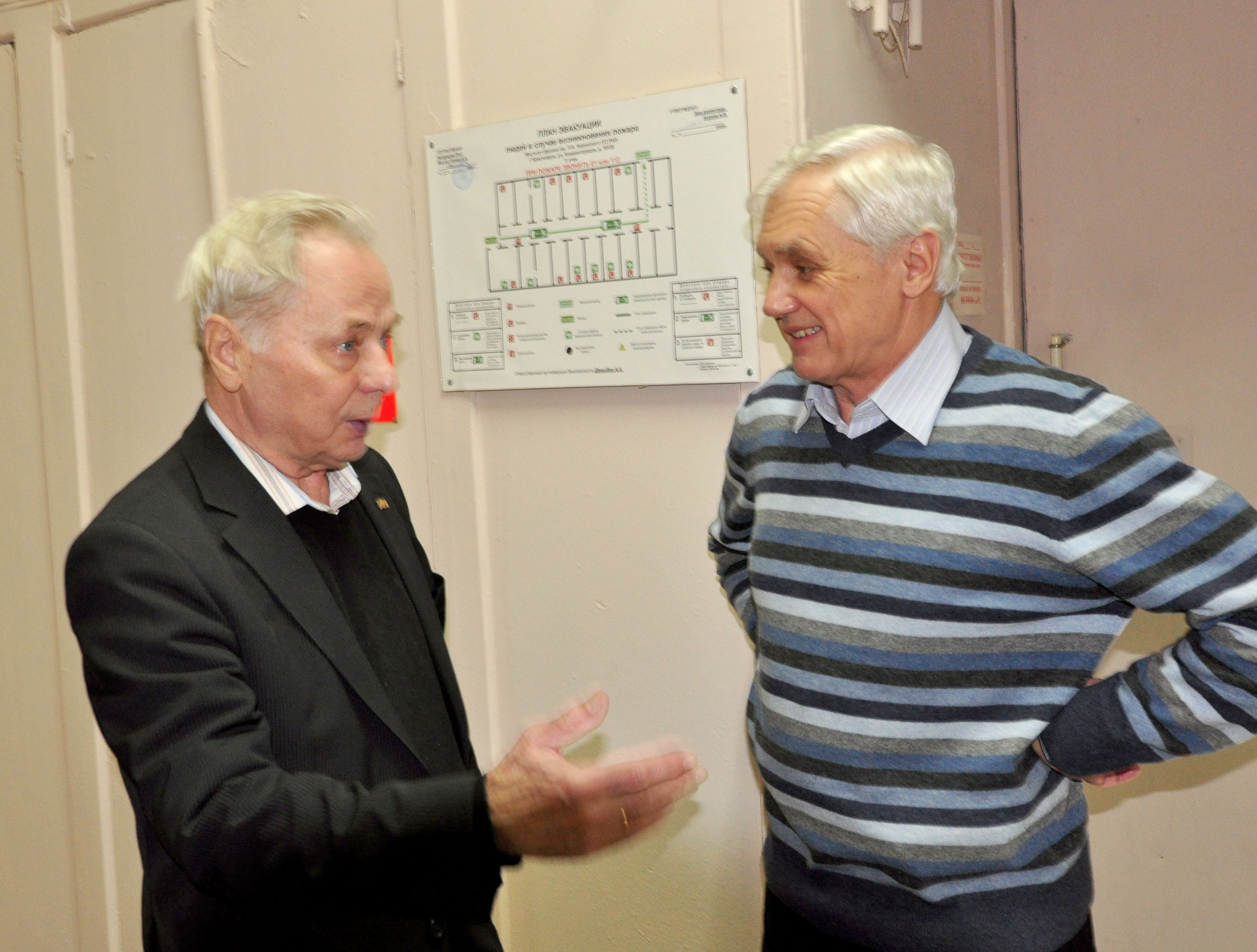 Мартынов Сергей Николаевич (слева), старший научный сотрудник лаборатории резонансных свойств магнитоупорядоченных веществ и Панкрац Анатолий Иванович, заведующий лабораторией резонансных свойств магнитоупорядоченных веществ Института физики им. Л.В. Киренского Сибирского отделения Российской академии наук (ИФ СО РАН), за обсуждением результатов эксперимента. Фото 2008 года. Красноярск
