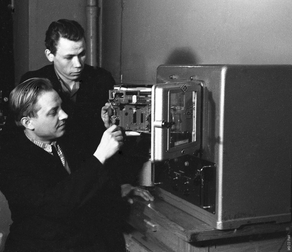 Русецкий Ю.С. (слева) и Бондарев А.Ф., сотрудники лаборатории молекулярной спектроскопии Института физики Сибирского отделения Академии наук СССР (ИФ СО АН СССР), ремонтируют записывающее устройство ДФС-12, фото 1965 года. Красноярск.