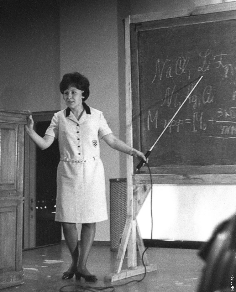 1967 год. На снимке аспирант С.Г. Русова. Занималась исследованием доменной структуры пленок на электронном микроскопе УЭМВ-100 в лаборатории структурных свойств тонких магнитных пленок Института физики Сибирского отделения Академии наук СССР (ИФ СО АН СССР) (СО АН СССР с 1991 года СО РАН). Красноярск.