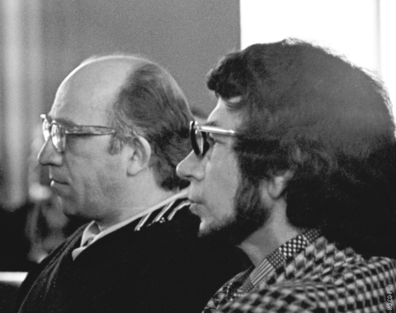 1975 год. Рябинкин Л.Н. (слева) и Фролов Г.И. на торжественном заседании в конференц-зале Института физики им. Л.В. Киренского Сибирского отделения Академии наук СССР (ИФ СО АН СССР), посвященном 30-летию Победы в Великой Отечественной войне (1941-1945 гг.).