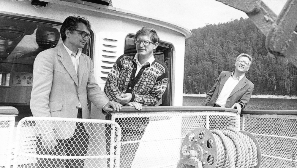 Участники второго Всесоюзного семинара «Резонансные, нелинейные, оптические процессы в газах», организованного Институтом физики им. Л.В. Киренского Сибирского отделения Академии наук СССР (ИФ СО АН СССР) в Дивногорске (Красноярский край)- Шабанов В.Ф. (слева) и Миронов В.Л. на рейсовом теплоходе Красноярск-Дивногорск, 1986 год.