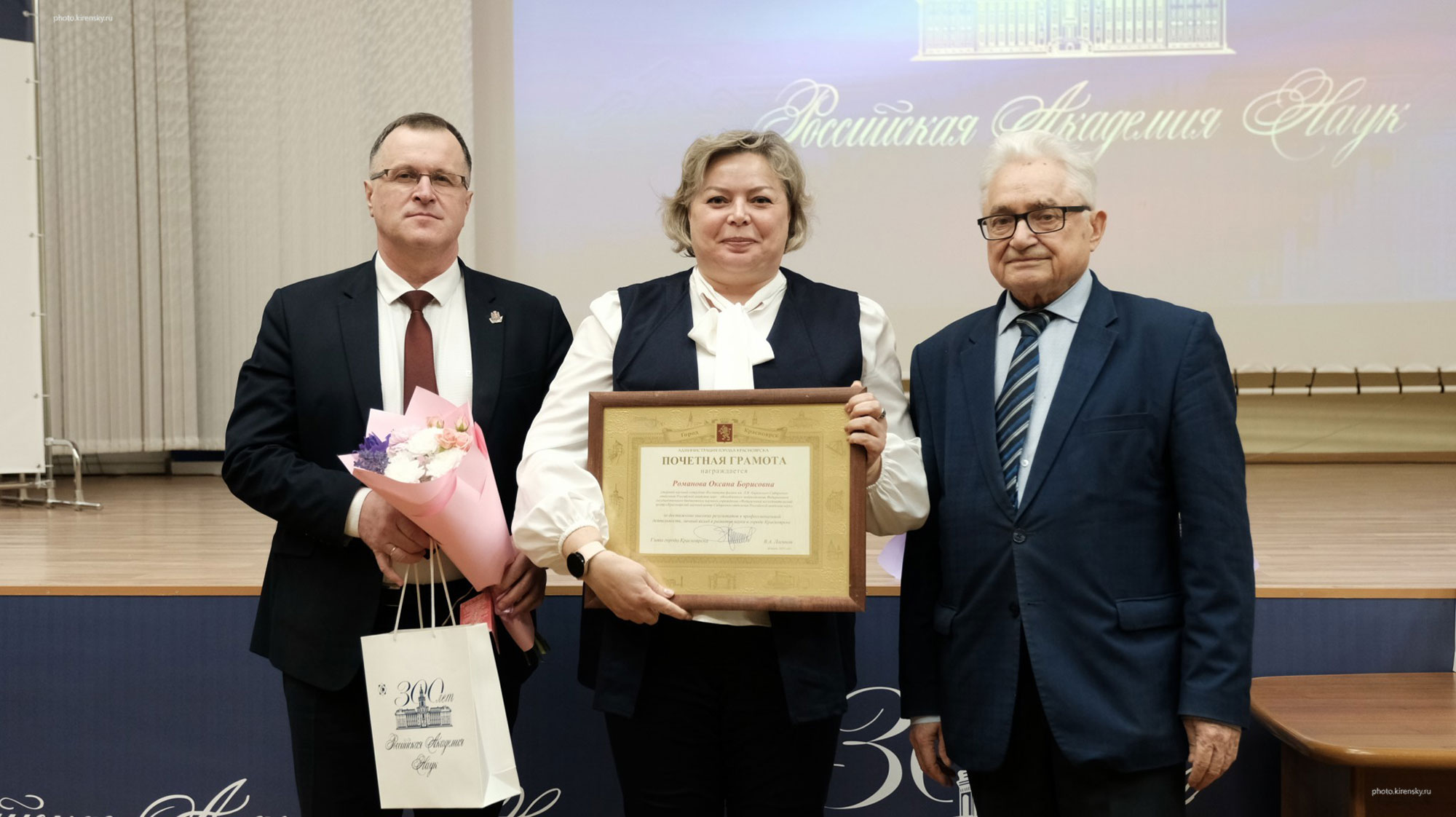 Романова Оксана Борисова, кандидат физико-математических наук, научный сотрудник лаборатории физики магнитных явлений Института физики им. Л.В. Киренского Сибирского отделения Российской академии наук в конференц-зале Института физики на вручении Почетной грамоты. Грамоту вручают: Шпедт Александр Артурович, директор Федерального исследовательского центра "Красноярский научнвй центр Сибирского отделения Российской академии наук (ФИЦ КНЦ СО РАН)( слева) и академик Шабанов Василий Филиппович, научный руководитель ФИЦ КНЦ СО РАН. Февраль 2024 года.