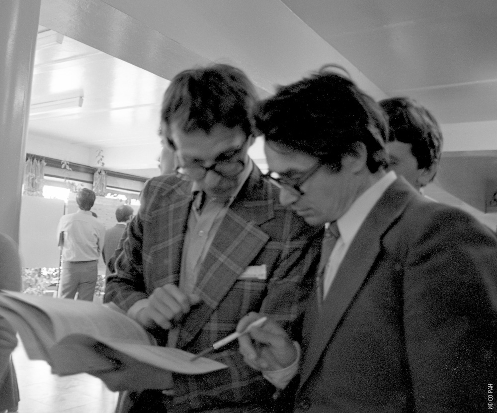 Шабанов Василий Филиппович (справа), заведующий лабораторией молекулярной спектроскопии Института физики им. Л.В. Киренского Сибирского отделения Академии наук СССР (ИФ СО АН СССР), на девятом Всесоюзном совещании "Применение колебательных спектров к исследованию неорганических и координационных соединений " в Шушенском (Красноярский край), у стендовых докладов. Совещание было организовано и проведено Институтом физики. 1987 год.