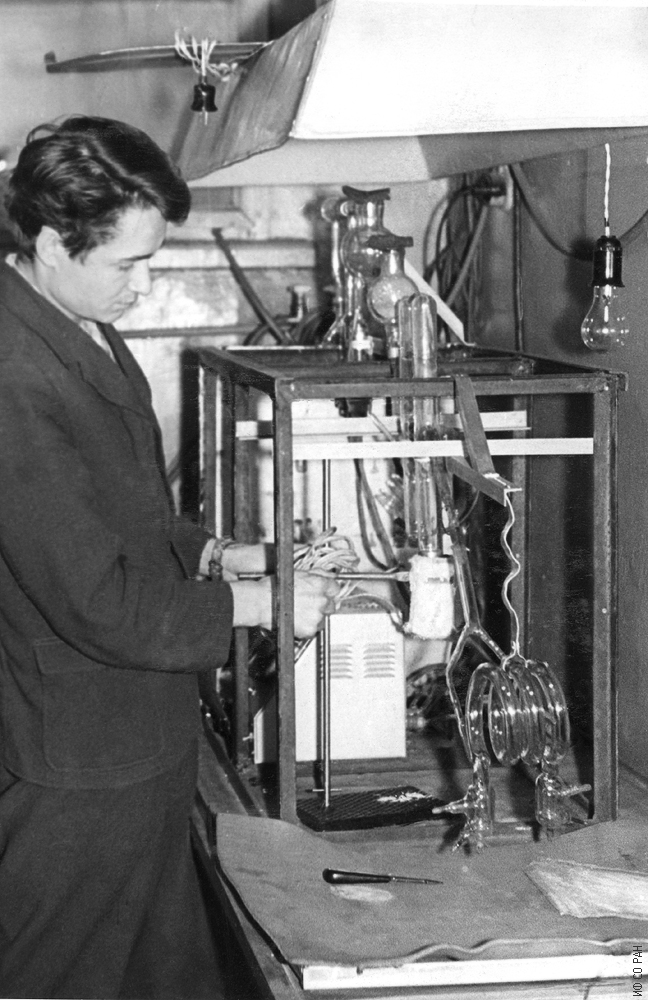 Аспирант лаборатории молекулярной спектроскопии Института физики Сибирского отделения Академии наук СССР (ИФ СО АН СССР) Шабанов В. Ф. за изготовлением лампы низкого давления, снимок 1965 года. Красноярск.