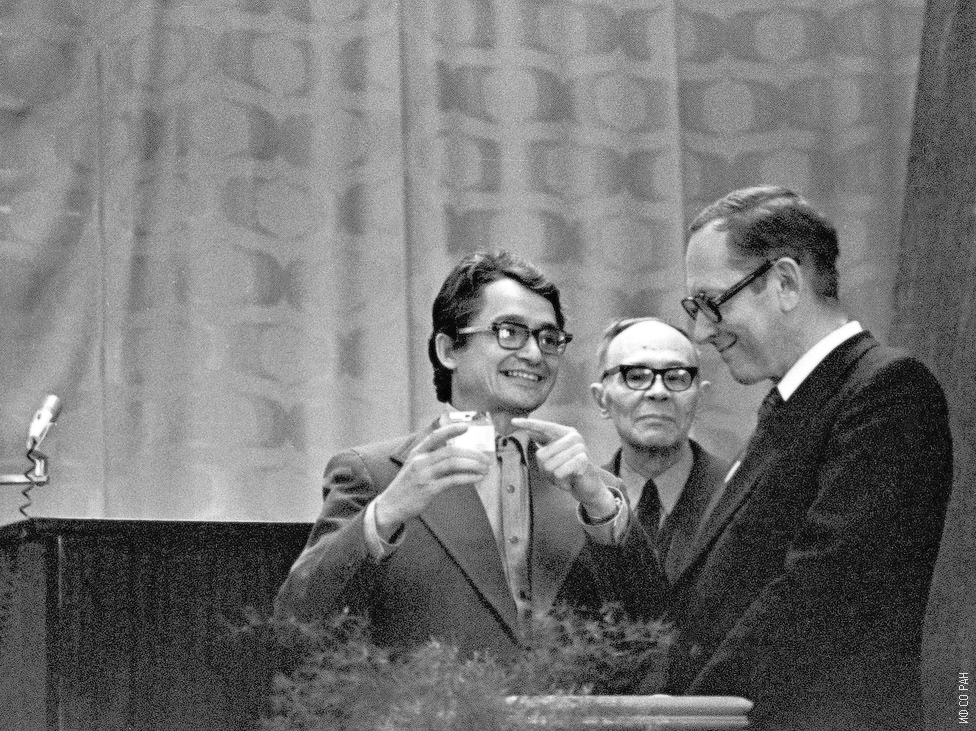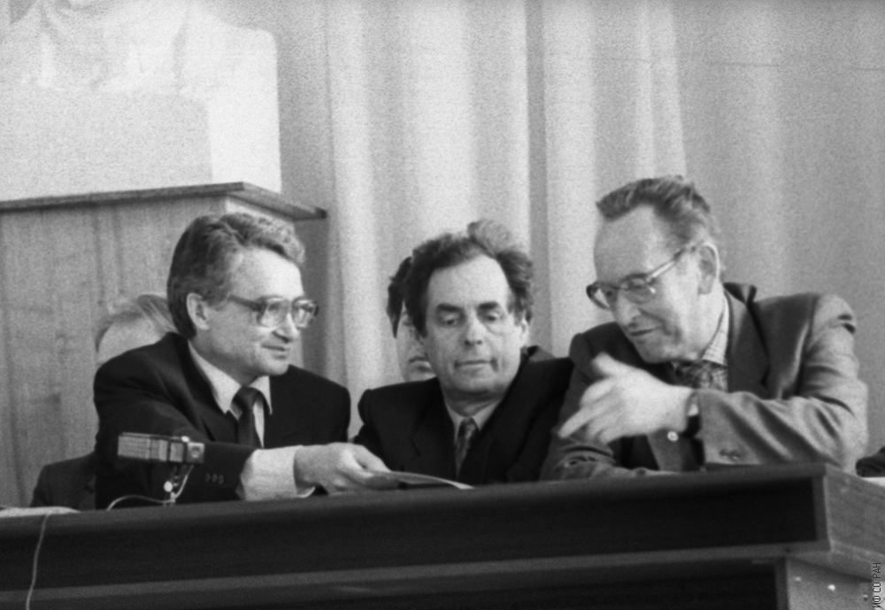 7 апреля 1988 года. Слева направо: Шабанов Василий Филиппович, Гительзон Иосиф Исаевич, Александров Кирилл Сергеевич, на научных чтениях, посвященных памяти академика Л.В. Киренского, организатора и первого директора Института физики им. Л.В. Киренского Сибирского отделения Академии наук СССР (ИФ СО АН СССР). Научные чтения памяти Леонида Васильевича проводились двумя институтами: ИФ СО АН СССР и Институтом биофизики СО АН СССР . Институт биофизики был организован в 1981 году на базе отдела биофизики Института физики. Красноярск. (Автор фотографии Безносиков Б.В.)