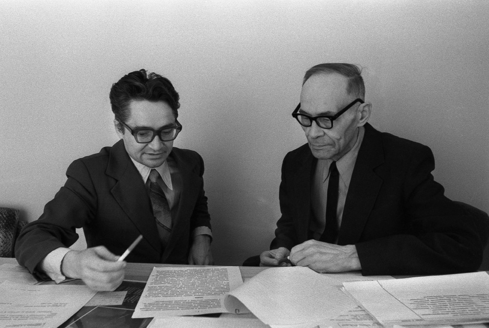 С 1970 года в Институте физики им. Л.В. Киренского Академии наук СССР (ИФ СО АН СССР) начали проводиться научные чтения памяти академика Киренского Леонида Васильевича, организатора и первого директора института. В 1981 году на базе отдела биофизики Института физики был организован Институт биофизики СО АН СССР. Чтения проводятся до сего времени (2020 год) двумя институтами поочередно. С 1991 года Академия наук СССР переименована в Российскую акдемию наук (РАН). На снимке 1988 года - заместитель директора Института физики Шабанов Василий Филиппович (слева) и директор Института биофизики Гительзон Иосиф Исаевич, на научных чтениях памяти Леонида Васильевича. Красноярск.