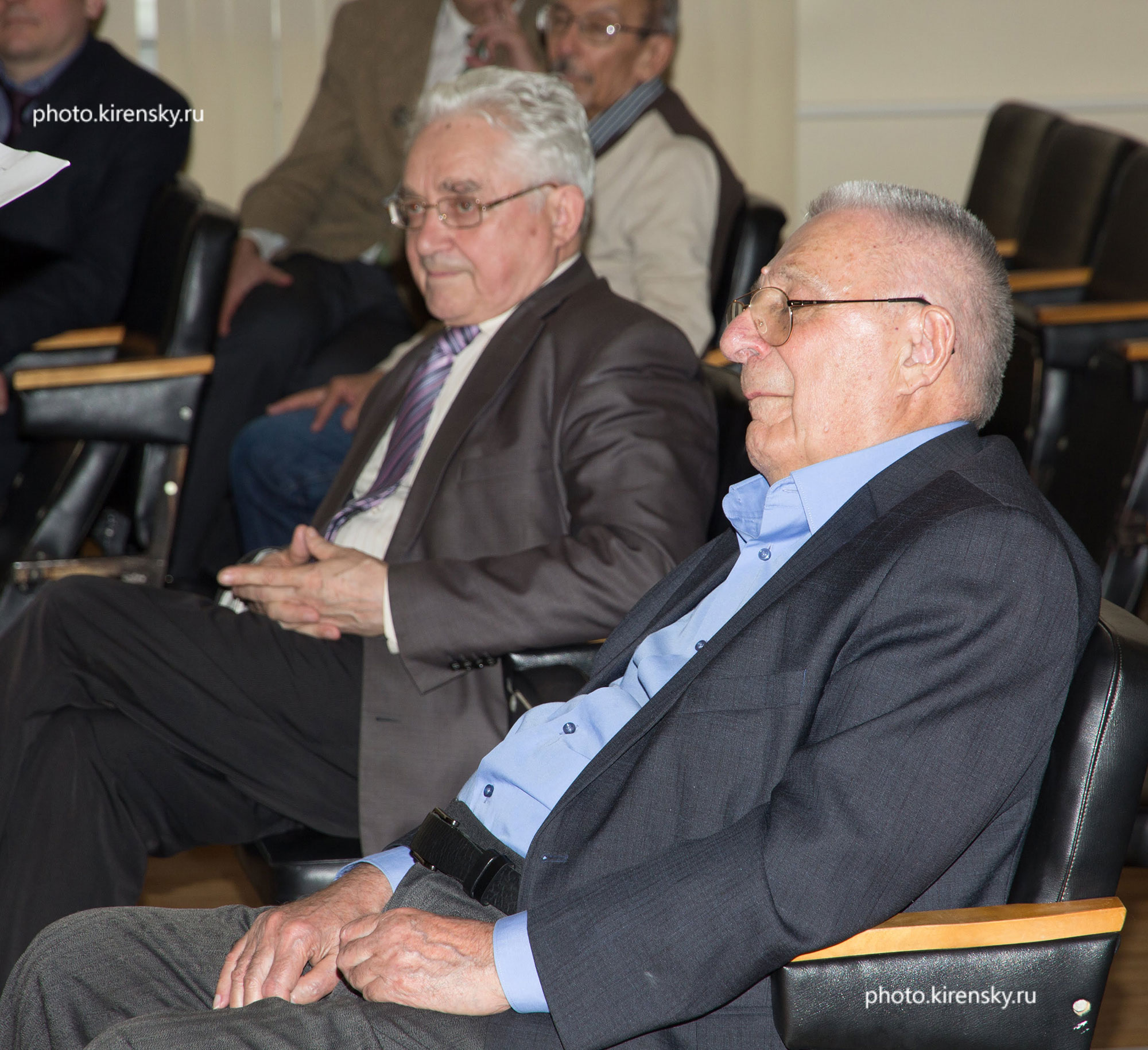 8 апреля 2018 года. Участники торжественного заседания ученого Совета Института физики им. Л.В. Киренского Сибирского отделения Российской академии наук (ИФ СО РАН), посвященного 109-ой годовщине со дня рождения организатора и первого директора института, академика Леонида Васильевича Киренского, в конференц-зале института. На переднем плане: академик Шабанов В.Ф. (слева), научный руководитель Федерального научного центра "Красноярский научный центр Сибирского отделения Российской академии наук" (ФИЦ КНЦ СО РАН) и профессор Игнатченко В.А., главный научный сотрудник лаборатории теоретической физики Института физики СО РАН. Красноярск.