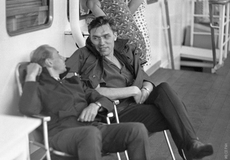 Смолин Р.П. (слева) и Чистяков Н.С., участники Всесоюзного симпозиума по сильным магнитным полям, организованного и проведенного Институтом физики Сибирского отделения Академии наук СССР (ИФ СО АН СССР), на теплоходе «В. Чкалов» (рейс Красноярск – Дудинка - Красноярск) в июле 1966 года.