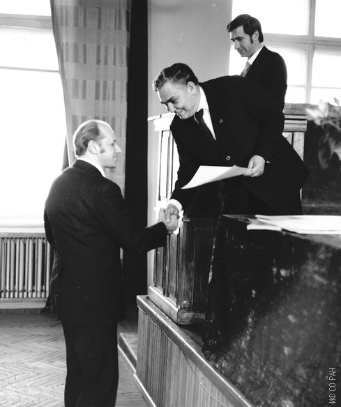 1974 год. На торжественном заседании сотрудников Института физики им. Л.В. Киренского Сибирского отделения Академии наук СССР, посвященном 250-летию образования Академии наук СССР, директор института И.А. Терсков вручает заведующему лабораторией магнитных материалов Р.П. Смолину почетную грамоту АН СССР, подписанную Президентом АН СССР М.В. Келдышем. За кафедрой ученый секретарь института Э.М. Смокотин, Красноярск.