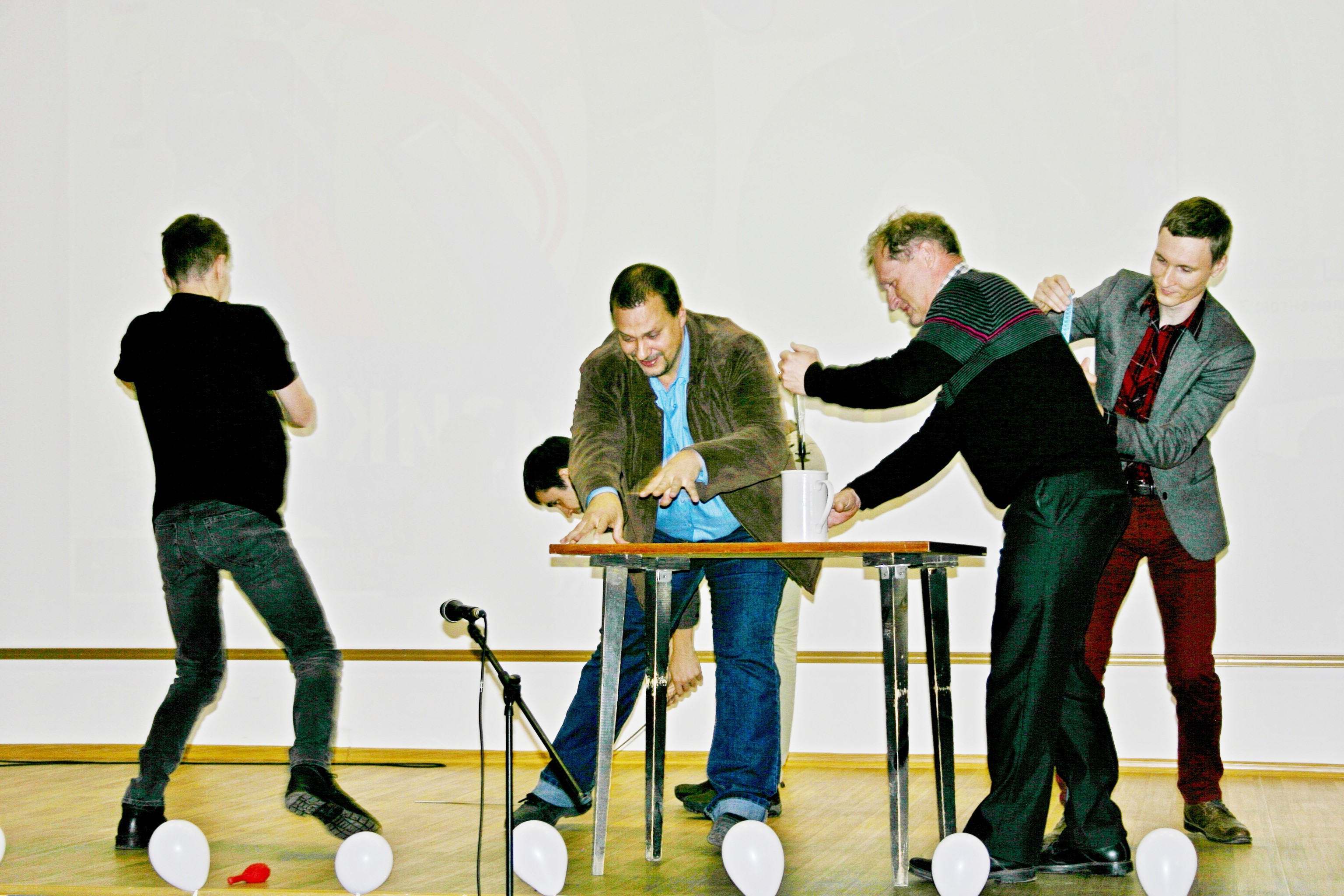 12 октября 2016 года. На празднике в честь 60-ия Института физики им. Л.В. Киренского Сибирского отделения Российской академии наук (ИФ СО РАН). Участники художественной самодеятельности лаборатории физики магнитных явлений, (слева направо): И.А. Яковлев, А.С. Федоров, А.Э. Соколов, В.И. Кузьмин. Красноярск.