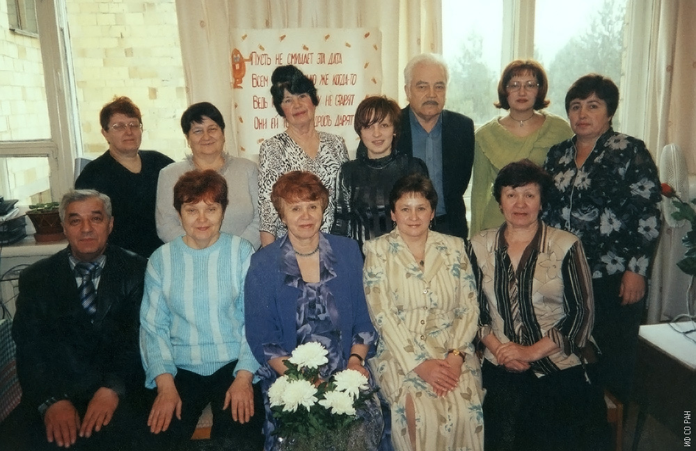 2006 год. Фото на память. У Елены Демьяновны Кармацкой (сидит в центре), коменданта здания Института физики им. Л.В. Киренского Сибирского отделения Российской академии наук (ИФ СО РАН) юбилей. Сидят, слева направо: Курилов В.Н., Шиян Г.В., Кармацкая Е.Д., Ткаченко Г.Г., Матыгулина М.М. Стоят, слева направо: Командина Н.Е., Лисицина В.В., Лоскутова Э.Ф., Кекина С.В., Кривов Ю.С., Ливченко О.В., Толкачева Т.В.