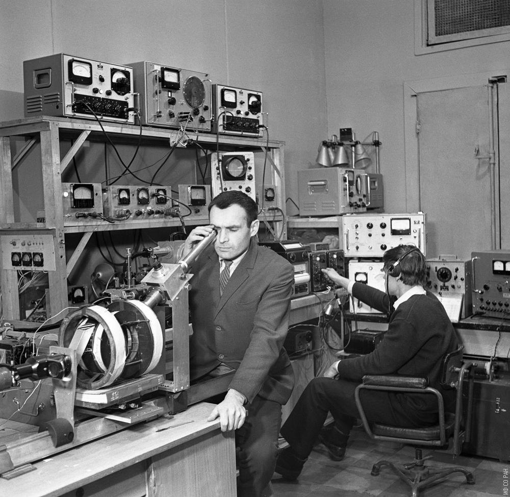 Тушков Б. П. (слева) и Русов Г. И. за работой на установке, разработанной и созданной Тушковым Б.П. в 1966 году в лаборатории физики магнитных явлений Института физики Сибирского отделения Академии наук СССР (заведующий лабораторией Л. В. Киренский). Установка позволяла проводить измерения составляющих комплексной СВЧ восприимчивости.