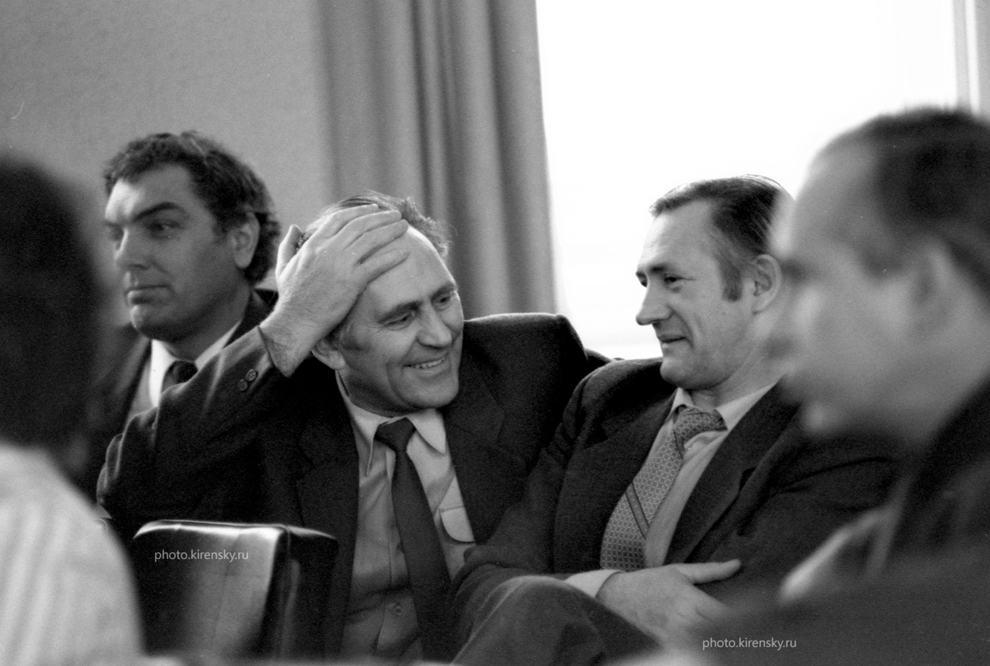 1980 год. В конференц-зале Института физики им. Л.В. Киренского Сибирского отделения Академии наук СССР, слева направо: Дрокин Н.А., младший научный сотрудник, Зеер Э.П., заведующий лабораторией радио-спектроскопического структурного анализа, Владимиров В.М., руководитель отраслевой лаборатории радиоэлектроники при Президиуме Красноярского научного центра Сибирского отделения АН СССР. Красноярск.