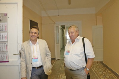 Член-корреспондент Российской академии наук (РАН) Мушников Н.В. (Институт физики металлов им. М.Н. Михеева Уральского отделения РАН (УрО РАН) (слева) с директором Института физики им. Л.В. Киренского Сибирского отделения Российской академии наук Волковым Н.В во время Евро-Азиатского симпозиума "Прогресс в магнетизме" (EASTMAG-2016) в Краснояррске.