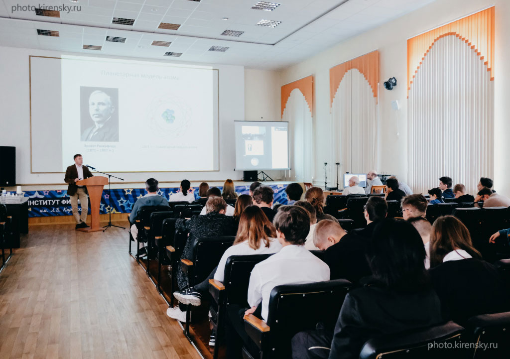 В конце октября 2022 года в Институте физики им. Л.В. Киренского Сибирского отделения Российской академии наук (ИФ СО РАН) для учеников школы № 10 имени академика Ю.А. Овчинникова – базовой школы РАН по направлению подготовки «Физика» – прошли памятные чтения, посвященные празднованию 100-летия со дня рождения нобелевского лауреата Николая Геннадьевича Басова. На снимке: Вьюнышев Андрей Михайлович, заместитель директора по научной работе Института физики им. Л.В. Киренского СО РАН кандидат физико-математических наук в своей лекции «Лазеры: предпосылки и история создания» рассказал ребятам о том, какие великие открытия начала XX века предопределили создание лазера. Красноярск.