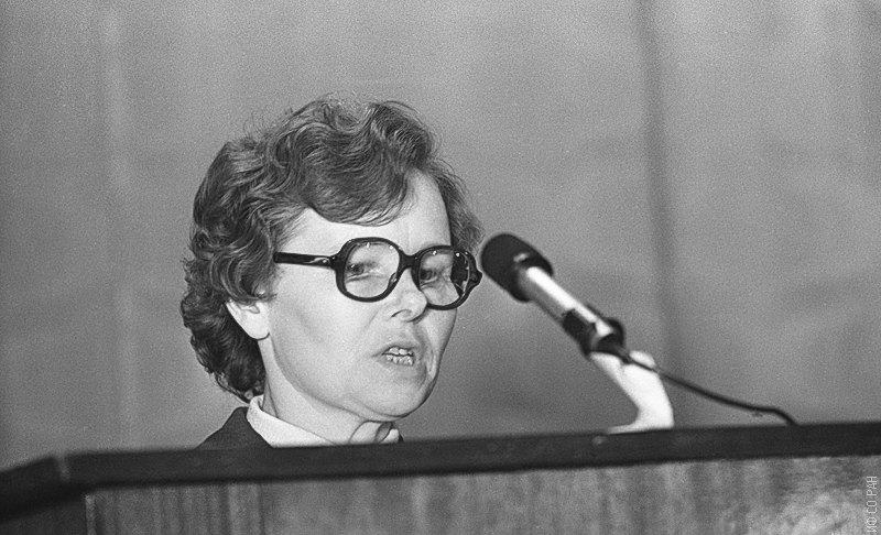 На снимке научные сотрудники лаборатории кристаллофизики Института физики им. Л.В. Киренского Сибирского отделения Академии наук СССР (СО АН СССР с 1991 года - СО РАН) Александрова И.П. (слева) и Зайцева М.П. в конференц-зале на обще институтском философском семинаре. Снимок 1972 года. Красноярск.
