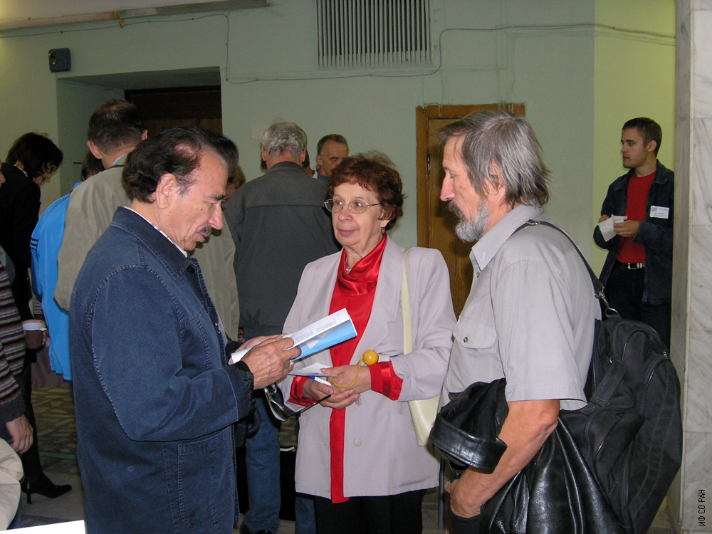 Рабочий момент на Евро-Азиатском симпозиуме «Прогресс в магнетизме» (ЕASTMAG-2004). Заседание секции «Микрокристаллические, аморфные и пористые слои. Новые приборные структуры на основе объемного материала и наноструктур». Сотрудники Института физики им. Л.В. Киренского Сибирского отделения Российской академии наук (ИФ СО РАН). Во втором ряду слева направо: Клавдия Павловна Полякова, Георгий Иванович Фролов, Виктор Степанович Жигалов, Красноярск, август 2004 год.
