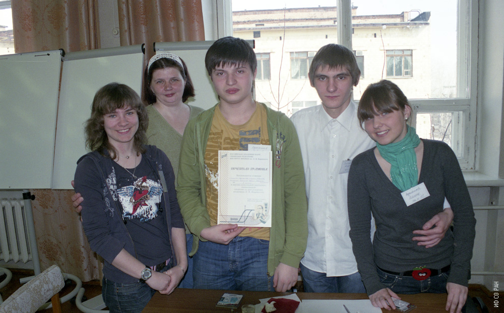Команда учащихся школы № 145 - победители викторины по физике для школьников, проведенной в честь 100-летнего юбилея Л.В. Киренского Советом молодых ученых, после вручения благодарственного письма и сувениров на память, фото 2009 г.
