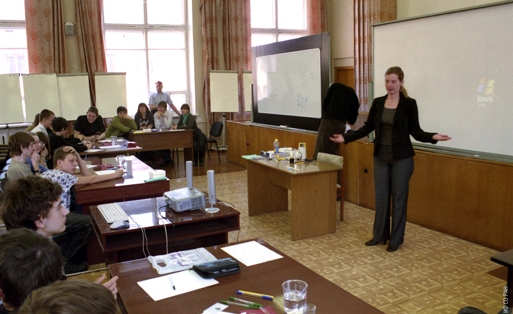 Шнейдер Е.И., старший научный сотрудник лаборатории физики магнитных явлений Института физики им. Л.В. Киренского Сибирского отделения Российской академии наук (ИФ СО РАН), задает очередной вопрос участникам викторины по физике для школьников Красноярска и Красноярского края. Векторина была организована и проведена в честь 100-го юбилея Л.В. Киренского Советом молодых ученых института в 2009 году. Проводилась в конференц-зале института.