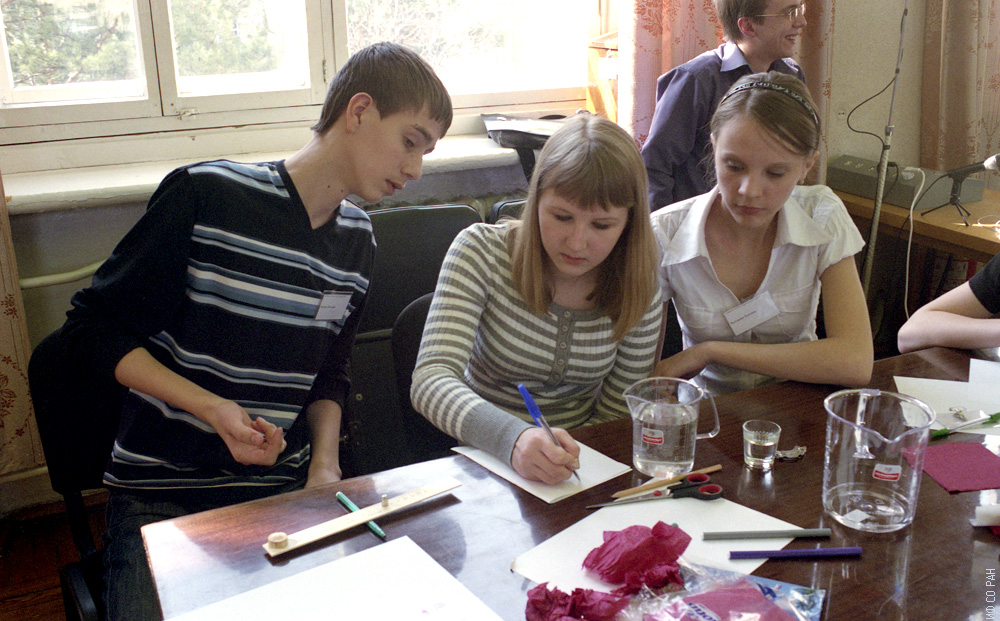 «А теперь расчет…!» Участники научно-популярной викторины по физике среди учащихся школ Красноярска и Красноярского края, посвященной 100-летию со дня рождения академика Л.В. Киренского. Члены команды школы № 3 поселка Березовка. Слева направо: Багров Дмитрий, Лепёшкина Екатерина, Зальцман Татьяна, фото 2009 г.