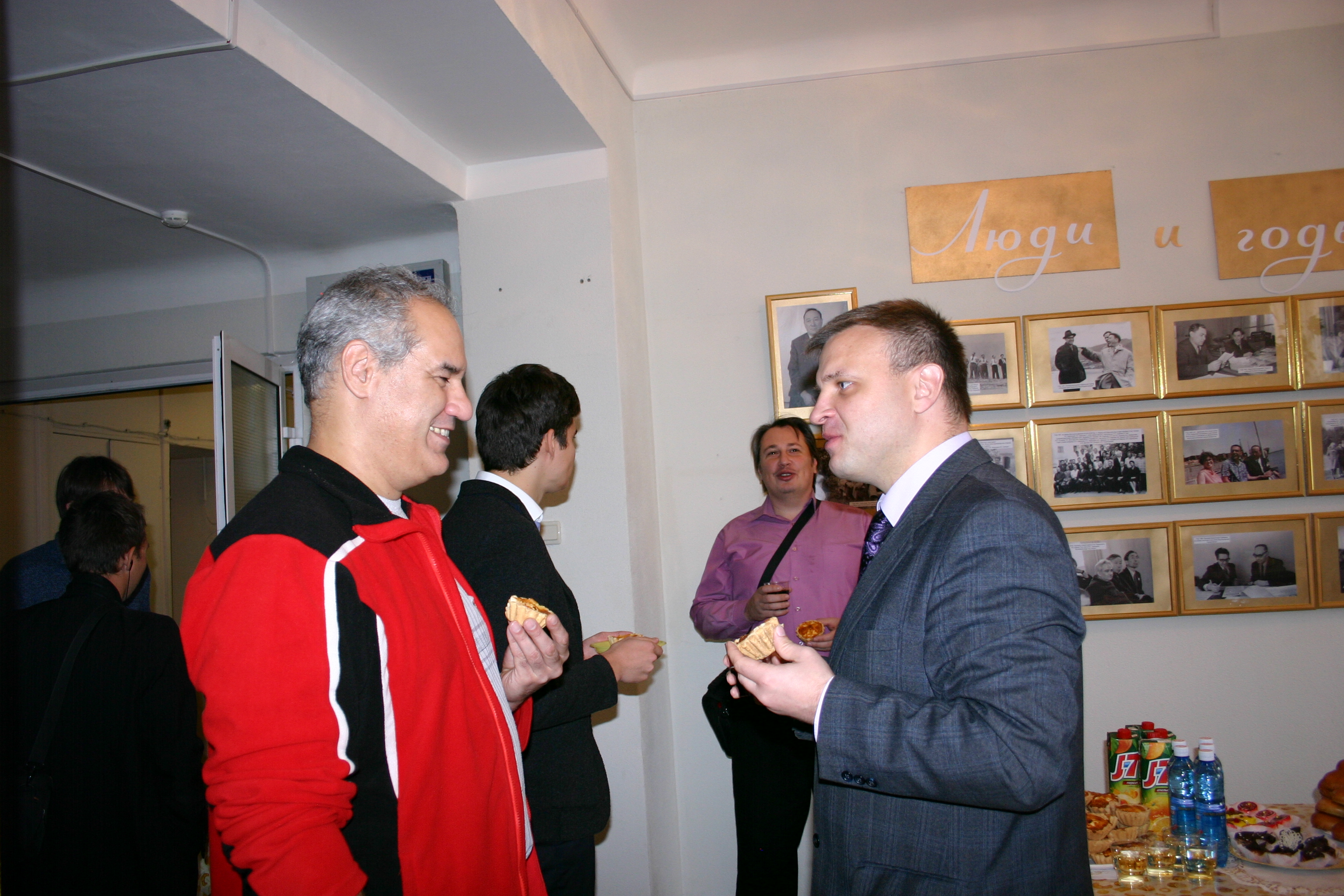 12 октября 2016 года. На празднике в честь 60-ия Института физики им. Л.В. Киренского Сибирского отделения Российской академии наук (ИФ СО РАН). Сотрудники института Д.М. Дзебисашвили (слева), ведущий научный сотрудник лаборатории теоретической физики и Ф.Н. Томилин, старший научный сотрудник лаборатории физики магнитных явлений. Красноярск.