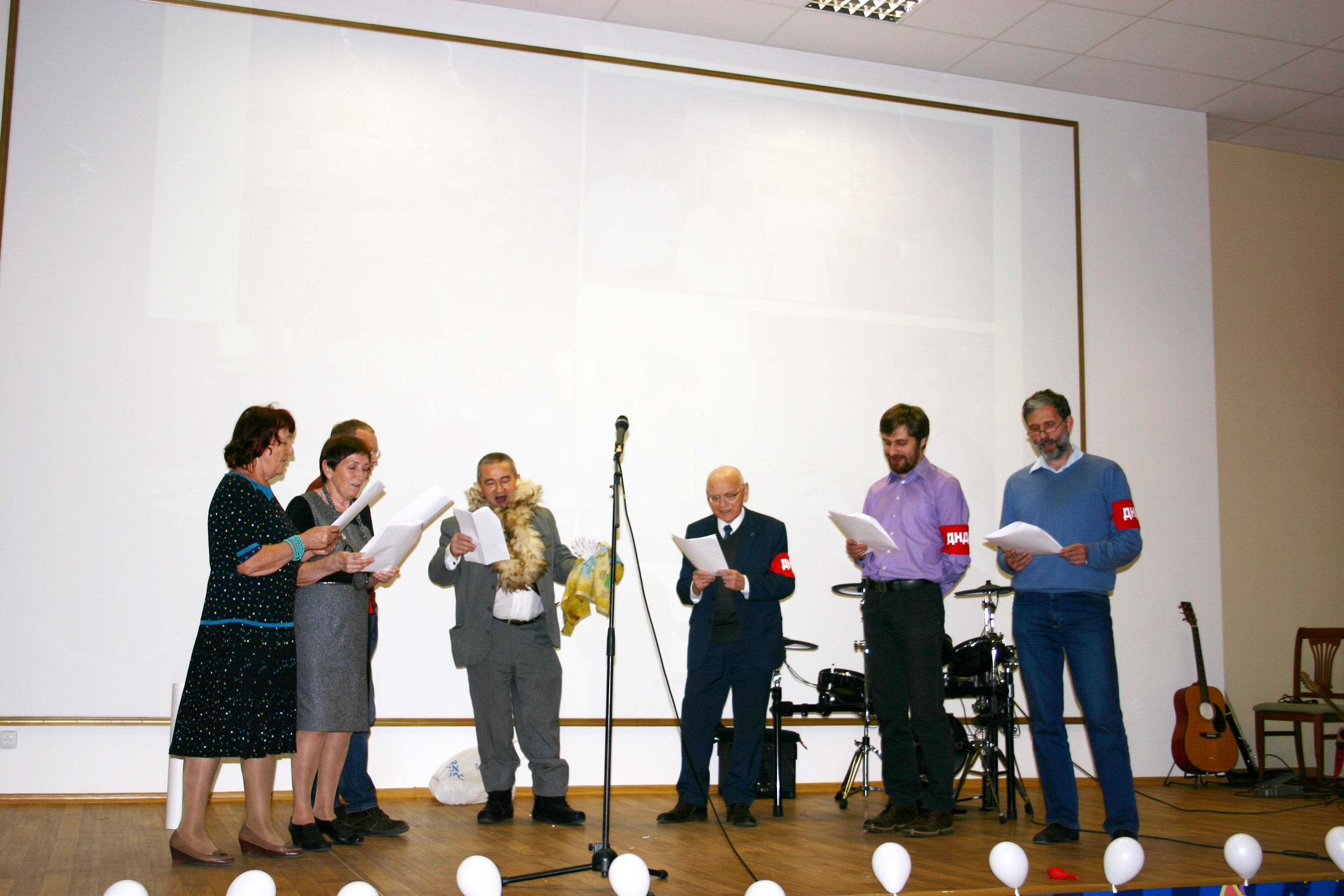12 октября 2016 года. Институту физики им. Л.В. Киренского Сибирского отделения Российской академии наук исполнилось 60 лет. Участники художественной самодеятельности лаборатории кристаллофизики института с поздравлением (слева направо): Мельникова С.В., Бовина А.Ф., Воронов В.Н., Флеров И.Н., Павловский М.С. Зайцев А.И. Красноярск.