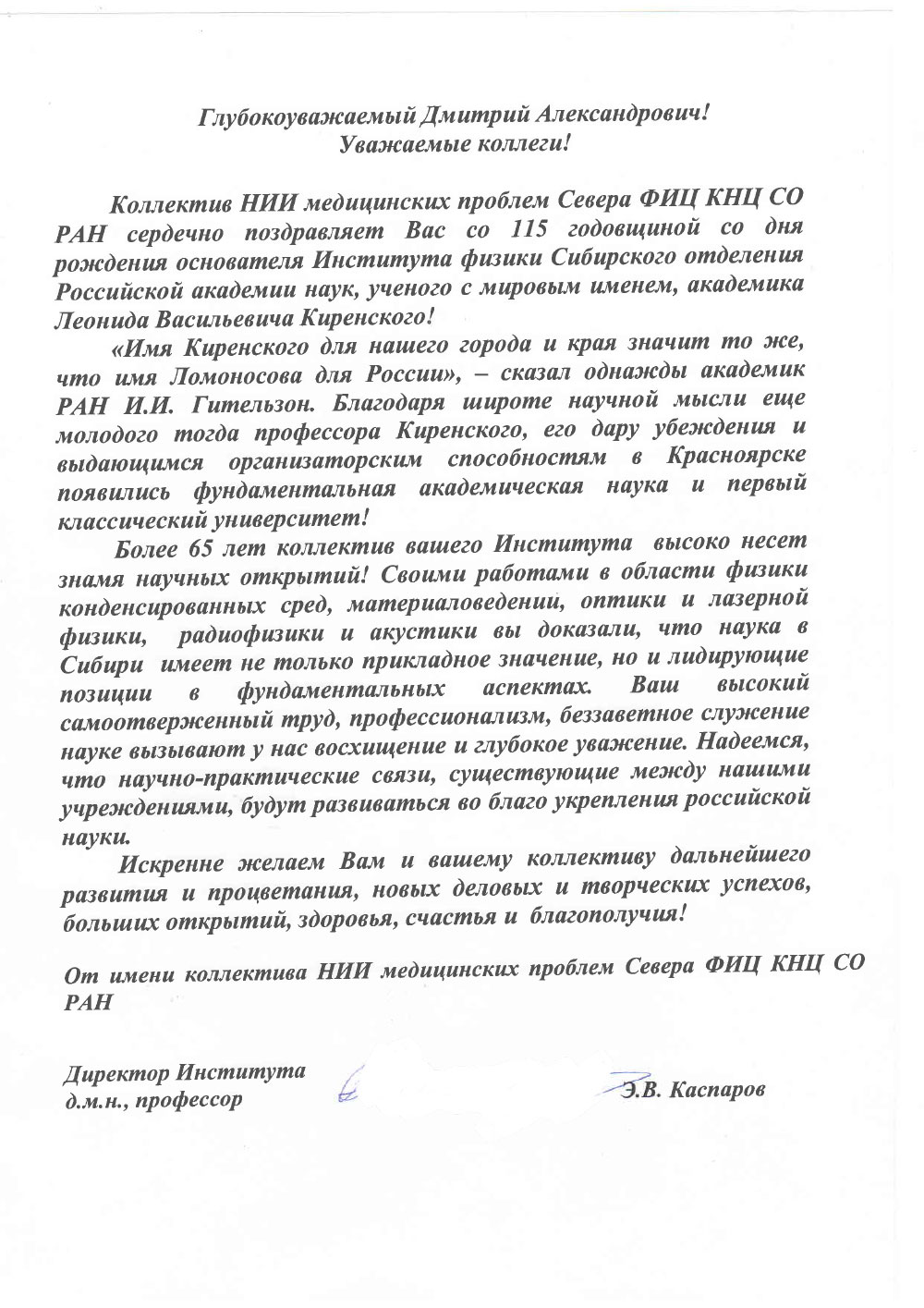 Вы здесь: Главная / События / Поздравления к 115 летию Л.В. Киренского / Поздравление от коллектива НИИ медицинских проблем Севера ФИЦ КНЦ СО РАН