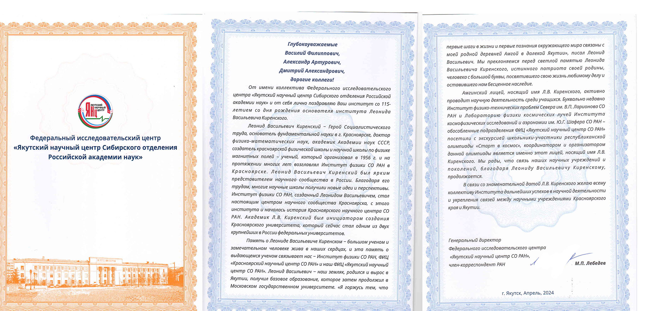 Вы здесь: Главная / События / Поздравления к 115 летию Л.В. Киренского / Поздравление от Якутского научного центра СО РАН