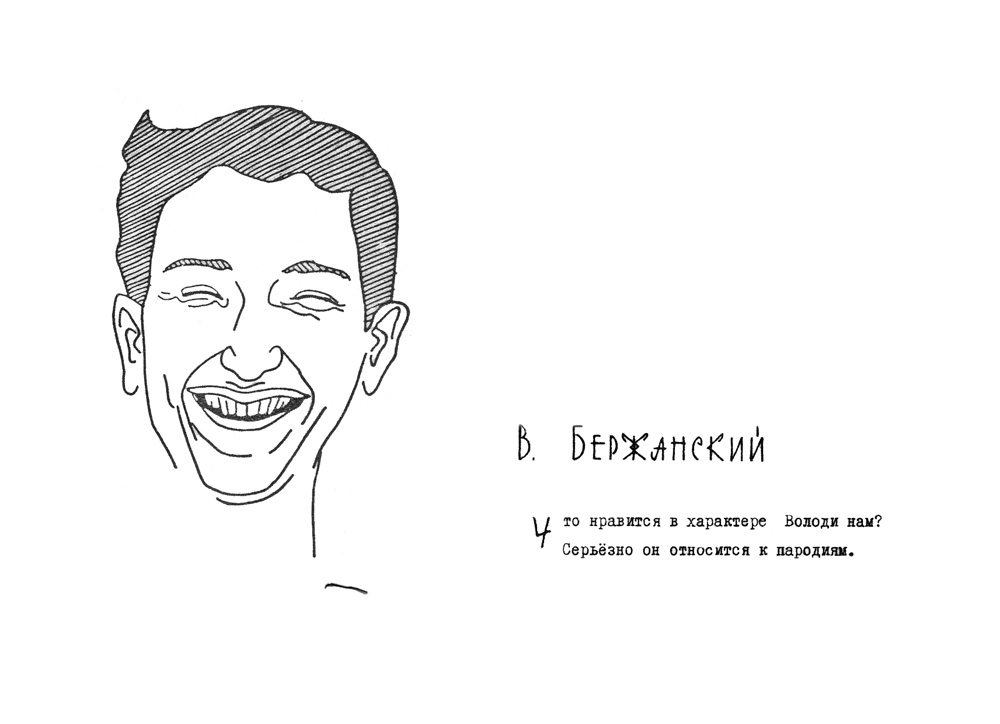 Дружеский шарж Бержанского В.Н. из книги шаржей "Музей друзей", первая часть которой вышла в 1967 году. Авторами ее являются научные сотрудники института О.А. Баюков и Н.С. Чистяков. Книга вышла малым тиражом (всего 100 экземпляров) и моментально разошлась среди персонажей книги, сотрудников и была подарком авторов к юбилею института, 1967 год.