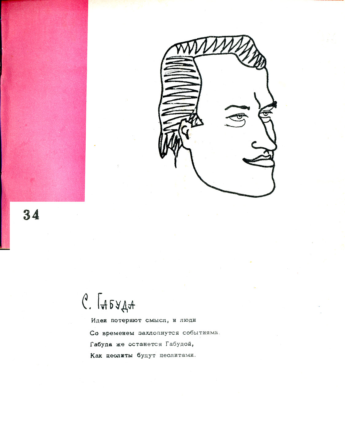 Дружеский шарж Габуды С.П. из книги "Музей друзей", изданной научными сотрудниками института Олегом Артемьевичем Баюковым и Николаем Сергеевичем Чистяковым. Удивительная книжка дружеских шаржей и эпиграмм на сотрудников Института физики СО АН СССР. Она вышла в 1967 году к 10-летию начала работы института. Вышла небольшим тиражом в 100 экземпляров и распространялась строго по списку, лично в руки. Узнать себя на страницах книги смогли 48 самых ярких и заметных личностей молодого института. Позже вышла вторая книга под таким же названием. Что побудило их взяться за такой труд, авторы подробно изложили в предисловии к первой и второй книгам. Книги размещены на сайте.