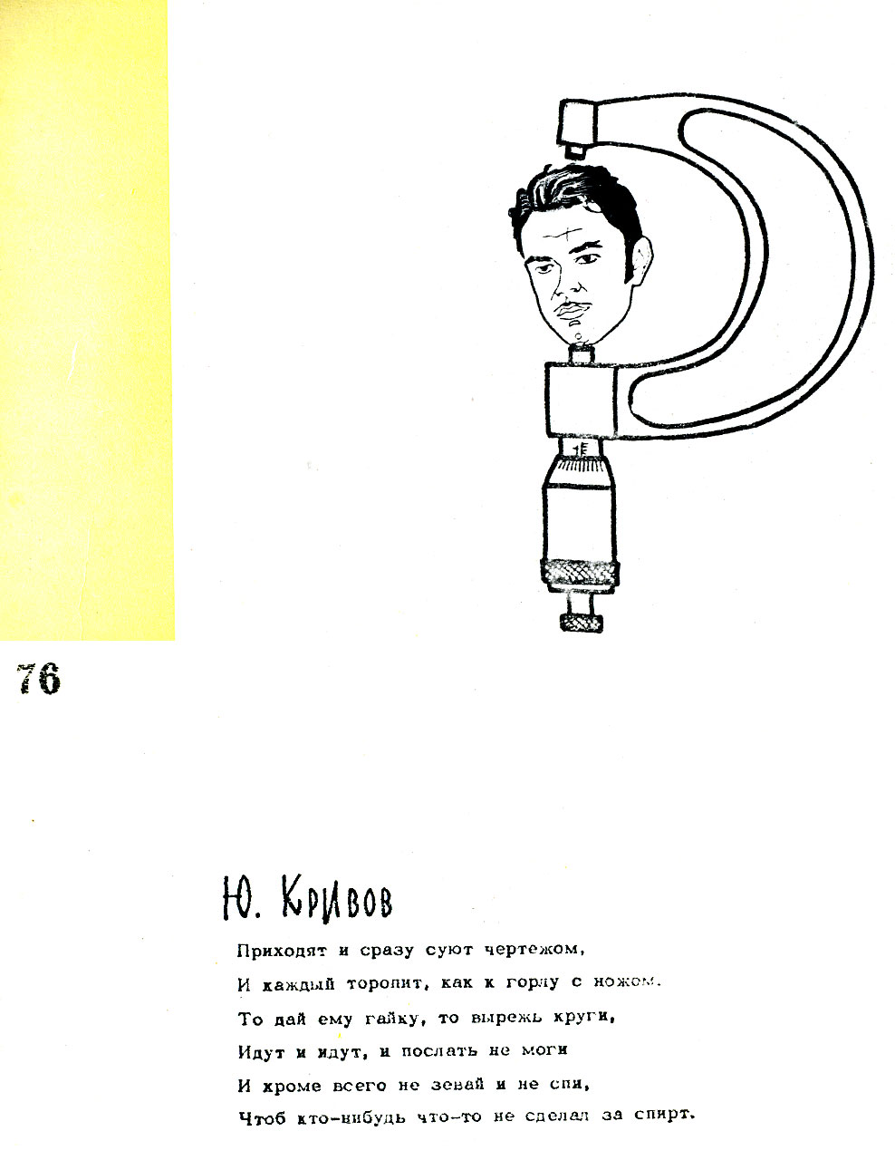 Дружеский шарж Кривова Ю.С. из книги "Музей друзей", изданной научными сотрудниками Института физики Сибирского отделения Академии наук СССР (ИФ СО АН СССР) Олегом Артемьевичем Баюковым и Николаем Сергеевичем Чистяковым. Удивительная книжка дружеских шаржей и эпиграмм на сотрудников Института физики СО АН СССР. Она вышла в 1967 году к 10-летию начала работы института. Вышла небольшим тиражом в 100 экземпляров и распространялась строго по списку, лично в руки. Узнать себя на страницах книги смогли 48 самых ярких и заметных личностей молодого института. Позже (в 1971 году) вышла вторая книга под таким же названием. Что побудило их взяться за такой труд, авторы подробно изложили в предисловии к первой и второй книгам. Книги размещены на сайте.