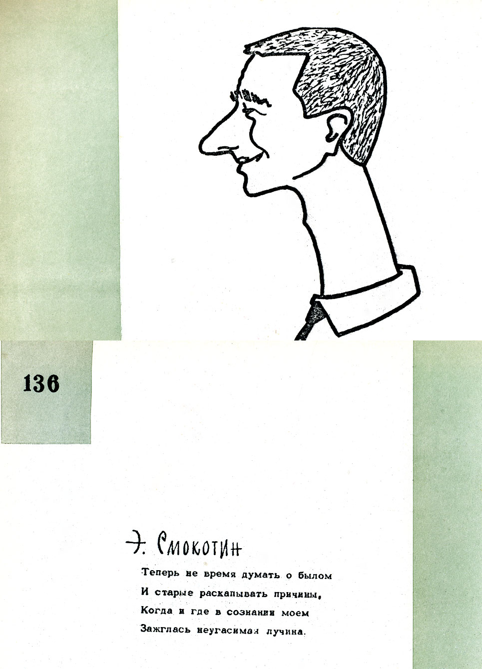 Дружеский шарж Смокотина Э.К. из книги "Музей друзей", изданной научными сотрудниками Института физики Сибирского отделения Академии наук СССР Олегом Артемьевичем Баюковым и Николаем Сергеевичем Чистяковым. Удивительная книжка дружеских шаржей и эпиграмм на сотрудников. Она вышла в 1967 году к 10-летию начала работы института. Вышла небольшим тиражом в 100 экземпляров и распространялась строго по списку, лично в руки. Узнать себя на страницах книги смогли 48 самых ярких и заметных личностей молодого института. Позже (в 1971 году) вышла вторая книга под таким же названием. Что побудило их взяться за такой труд, авторы подробно изложили в предисловии к первой и второй книгам. Книги размещены на сайте. Красноярск.